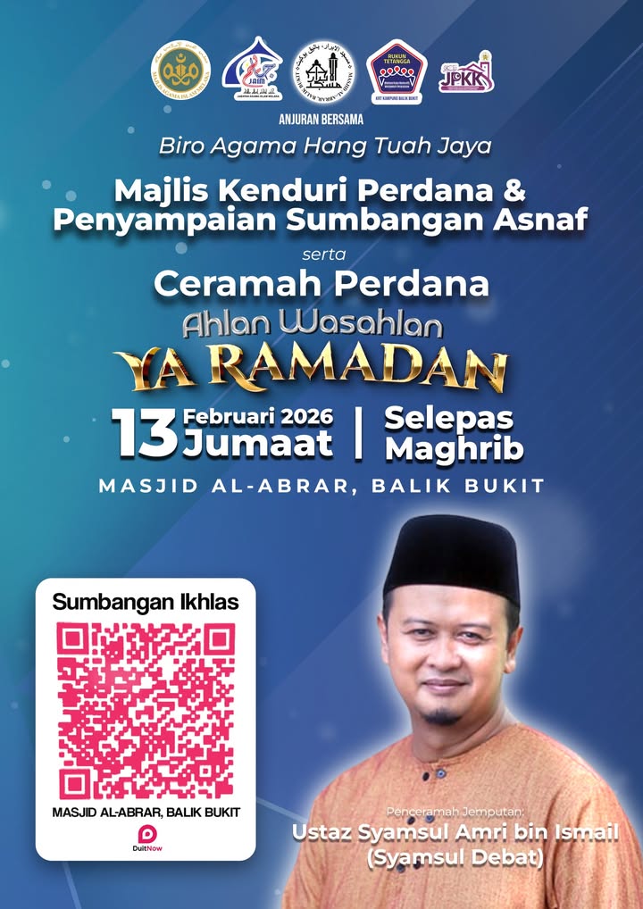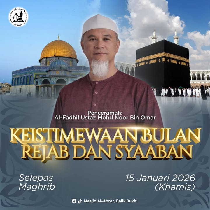 Ceramah Bulanan Masjid Al-Abrar Balik Bukit. TARIKH: 15.01.2026 HARI: KHAMIS MALAM JUMAAT MASA: SELEPAS MAGHRIB TEMPAT: MASJID AL-ABRAR BALIK BUKIT, BUKIT LINTANG MELAKA. PENCERAMAH: AL-FADHIL USTA...